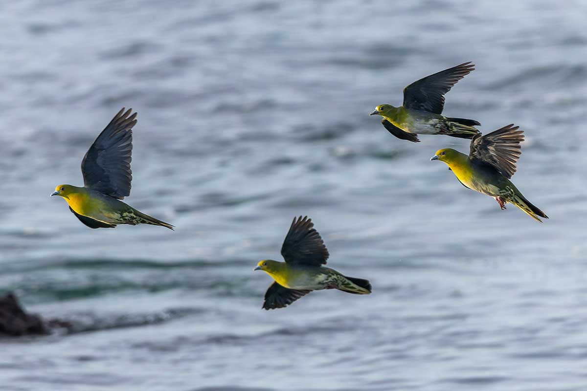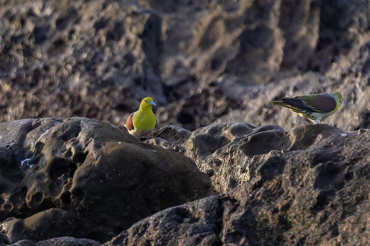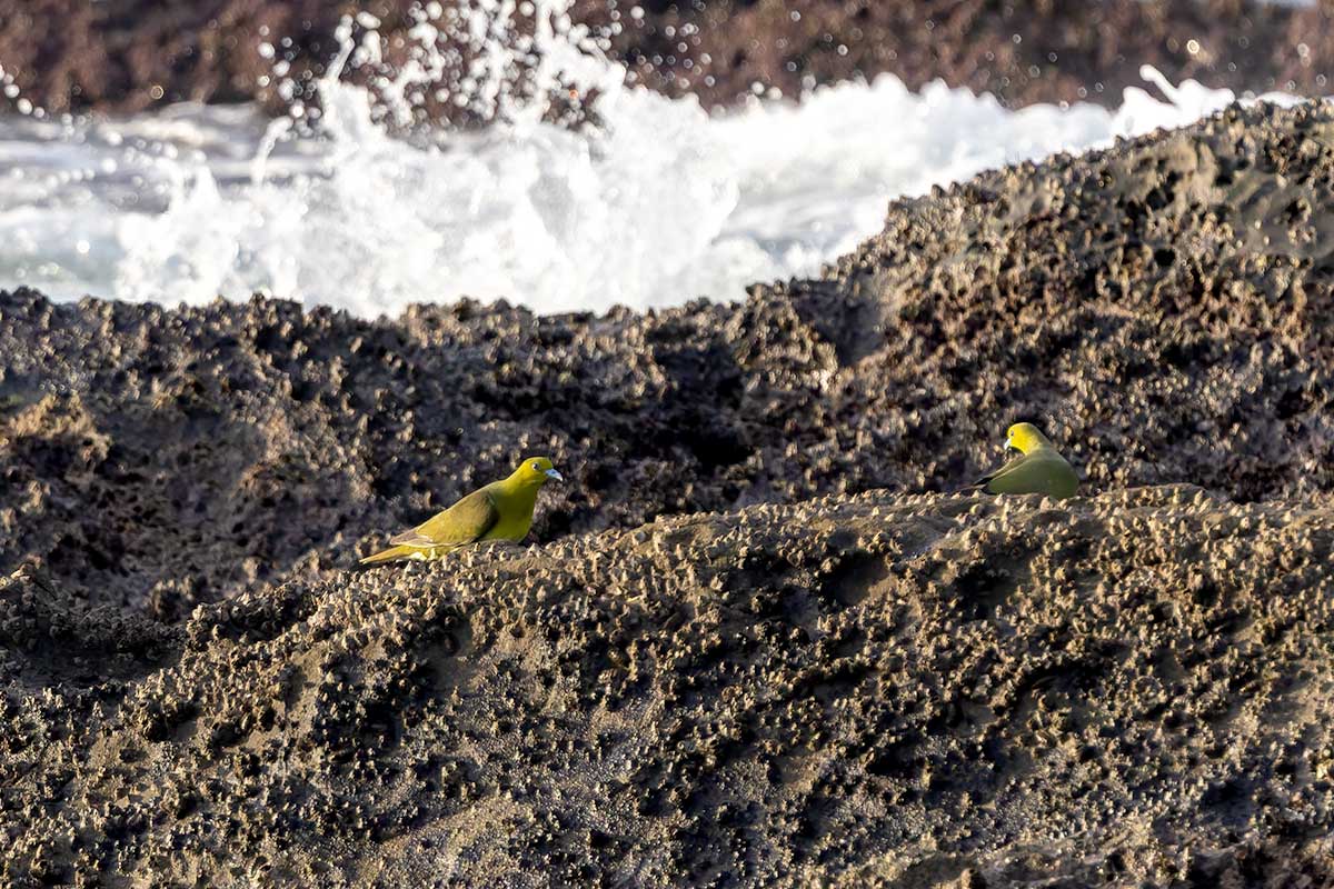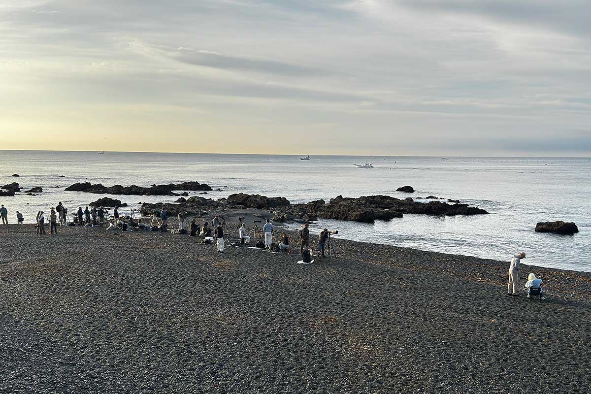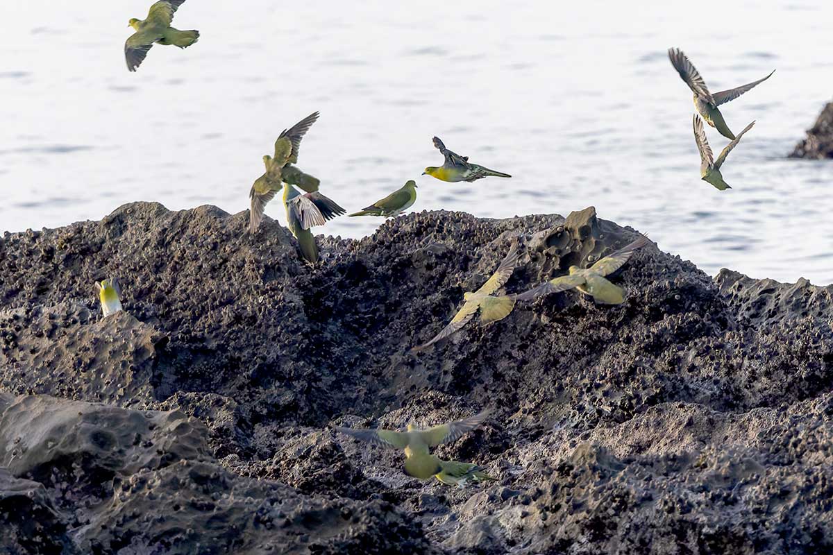 撮影スポットは砂浜だったので、長靴にするか迷いましたが、普段使いのトレッキングシューズで十分でした。すでに20人以上のカメラマンが三脚を立て、アオバトの飛来を待っている様子。海水を飲みに来る岩礁は50メートル以上離れていて非常に遠く、飲水シーンの撮影は叶いませんでしたが、なんとか飛翔写真は撮ることができました(^▽^;)