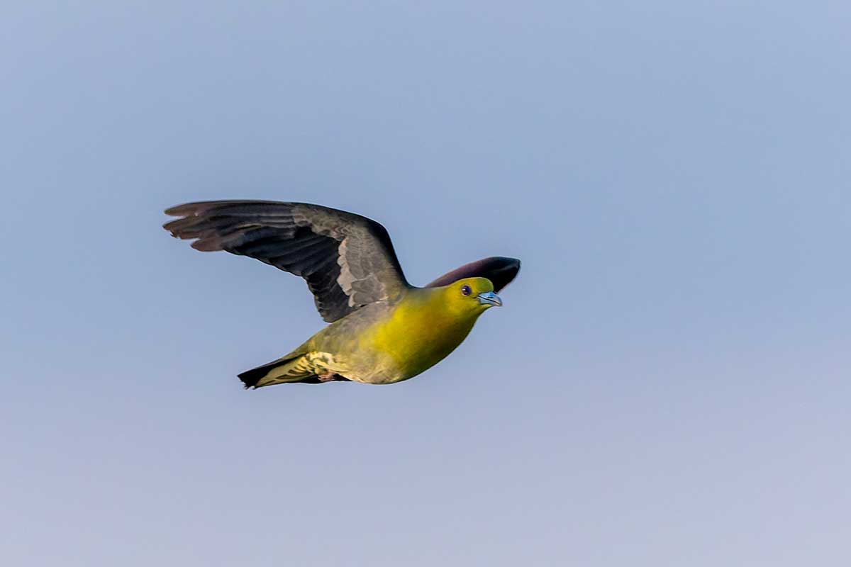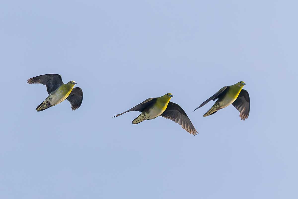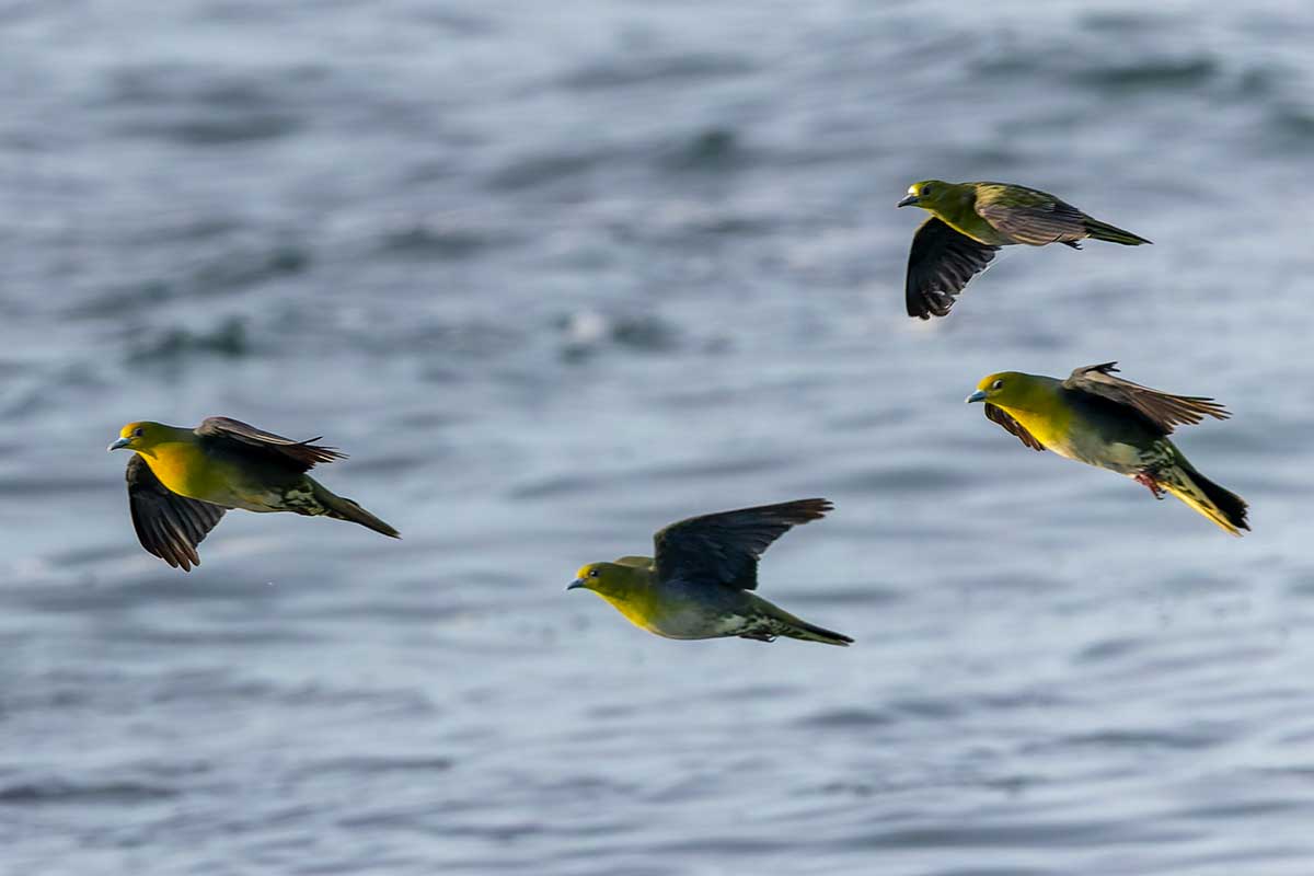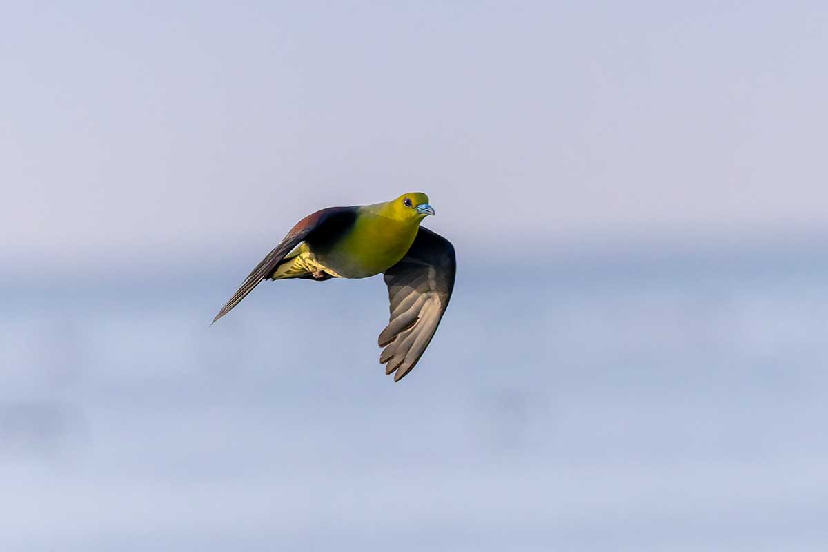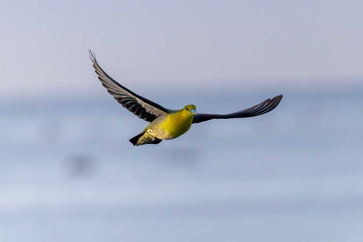 撮影スポットは砂浜だったので、長靴にするか迷いましたが、普段使いのトレッキングシューズで十分でした。すでに20人以上のカメラマンが三脚を立て、アオバトの飛来を待っている様子。海水を飲みに来る岩礁は50メートル以上離れていて非常に遠く、飲水シーンの撮影は叶いませんでしたが、なんとか飛翔写真は撮ることができました(^▽^;)